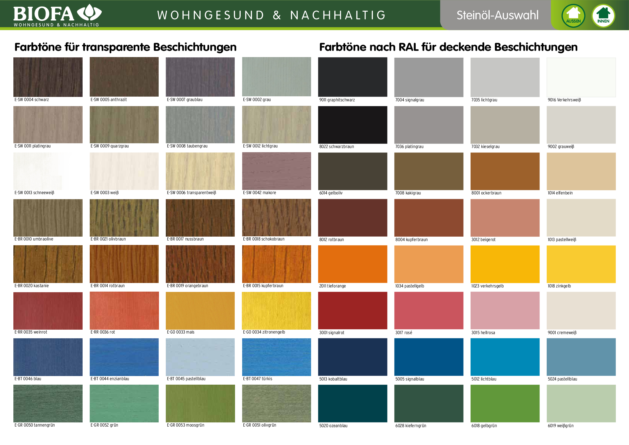 Steinöl kann von BIOFA ab Werk nach dem RAL- und dem BIOFA Eluc-Farbfächer in vielen verschiedenen Farbtönen abgetönt werden.