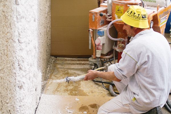 HAGA Biotherm kann von Hand oder maschinell verarbeitet werden, z.B. mit Varojet 499, Putzjet FAH-89 oder PFT-G4. Die Eignung anderer Maschinen ist vorher abzuklären! Maschinen sind immer mit einer DämmputzMischwelle auszurüsten. Arbeitsunterbrüche sind zu vermeiden, angemachter Dämmputz innert max. 10 Minuten verarbeiten. Schichtdicken 2-20 cm und mehr, bis ca. 5 cm in einem Arbeitsgang. Bei mehrschichtigem Aufbau ist die jeweils aufgebrachte Putzschicht vor dem Erhärten gut aufzurauhen. Nach Aufspritzen muss der Dämmputz sofort mit einer Latte abgezogen werden! HAGA Biotherm mit Metall-Latte planeben abziehen, mit Talosche sofort oder am nächsten Tag mit Gitterrabot sauber nachbearbeiten. Nicht unter +5°C bis maximal 30°C Luft- und Mauertemperatur verarbeiten. Direkte Sonnenbestrahlung bei der Ausführung vermeiden. Im Schatten liegende Fassade verputzen. Frisch ausgeführte