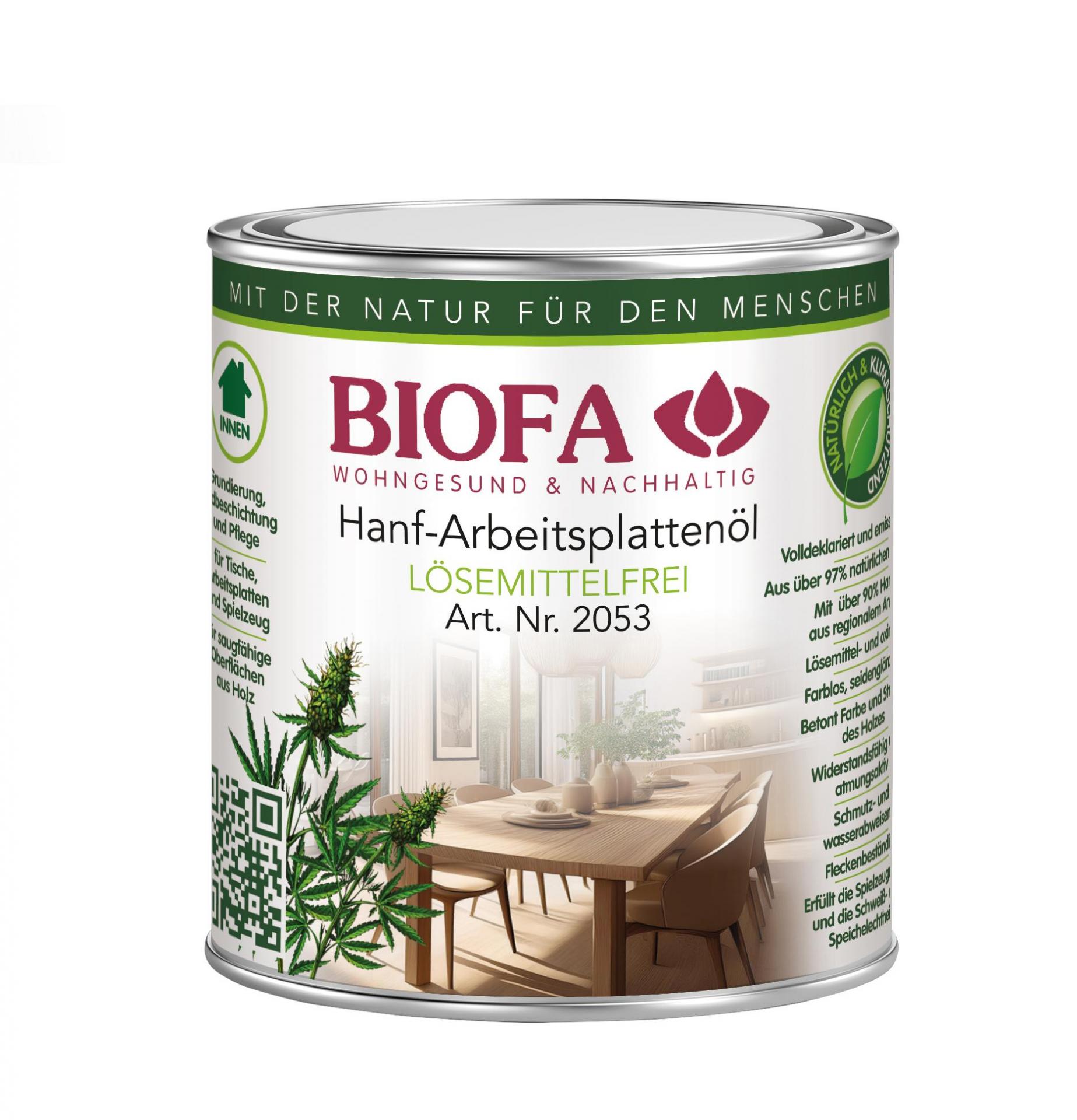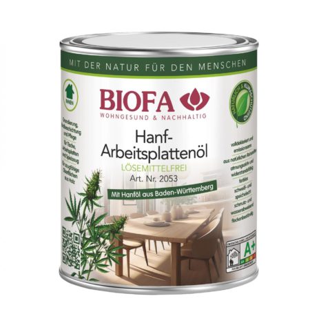 Eigenschaften: Das farblose, natürliche BIOFA Hanf-Arbeitsplattenöl besteht zu über 97% aus natürlichen Rohstoffen. Davon sind über 90% Hanföl, das aus regionalem Anbau stammt. Es dringt tief in das Holz ein, ist diffusionsfähig, antistatisch, widerstandsfähig gegen Flüssigkeiten, belebt und vertieft die natürliche Struktur und Tönung der behandelten Hölzer und schafft widerstandsfähige, seidenglänzende Oberflächen. Das Hanf-Arbeitsplattenöl erfüllt die Norm EN 71, Teil 3 (Sicherheit von Kinderspielzeug, Migration von Schwermetallen) sowie die Schweiß- und Speichelechtheit.
