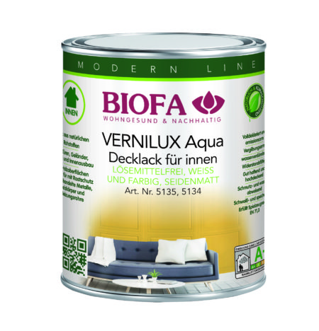 BIOFA VERNILUX Aqua ist ein wasserverdünnbarer, widerstandsfähiger und wasserabweisender Innenlack. Er besitzt eine gute Haftung und ein hohes Deckvermögen. Der Lack eignet sich für alle Hölzer im Innenbereich wie z.B. Türen, Geländer, Möbel, Innenausbau etc. Auch für Metalluntergründe sowie Heizkörper und Heizungsrohre nach entsprechender Vorbehandlung geeignet. Erfüllt die Norm EN 71, Teil 3 (Sicherheit von Kinderspielzeug) sowie die DIN 53160 (Schweiß- und Speichelechtheit).