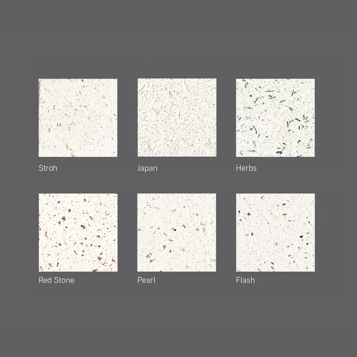 Zusammensetzung Gemischtkörniger Sand, farbige Lehme und Tone, Perlite, Cellulosefasern, Methylcellulose < 0,5% (wasserlösliche Stabilisierung). Körnung bis 1 mm. Strukturzuschläge Strohfasern (Stroh), Granit (Red-Stone), Glitter (Flash), Perlmut (Pearl), Sisal (Japan), Kräuter (Herbs). Farbgebung durch die Tonerden, keine weiteren Pigmente.